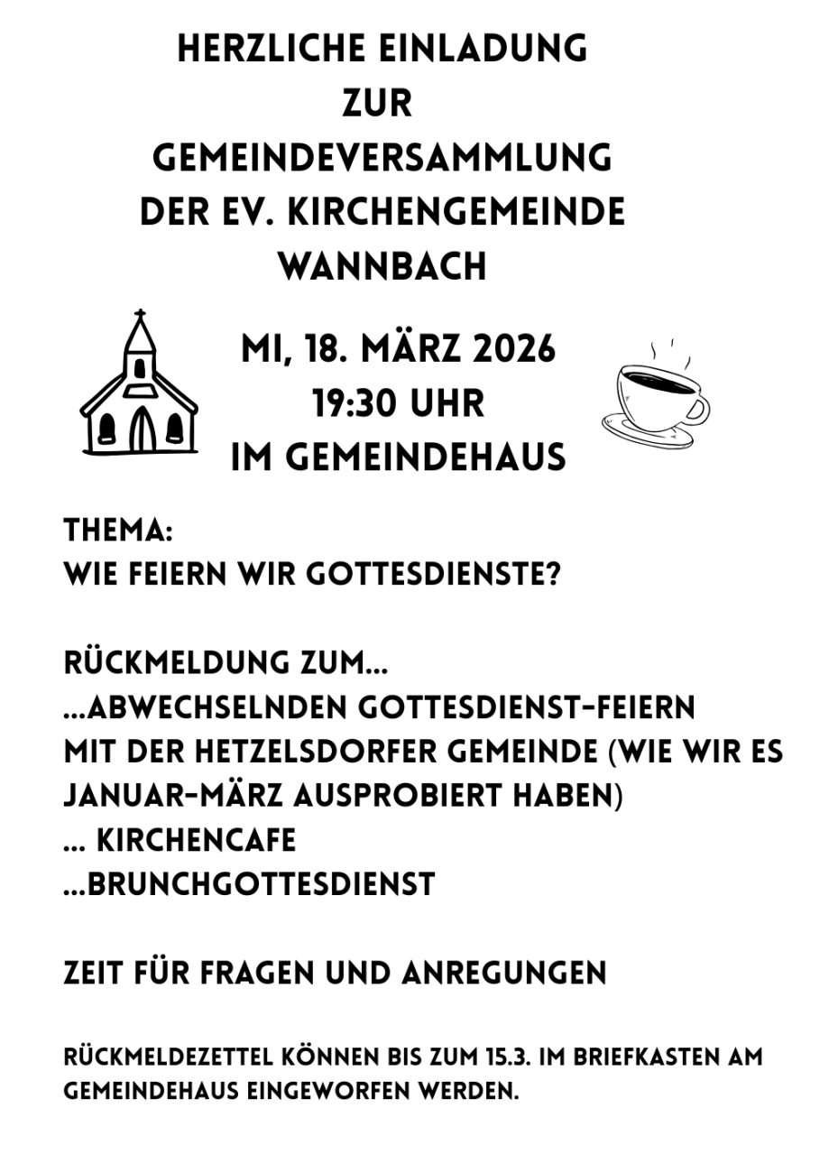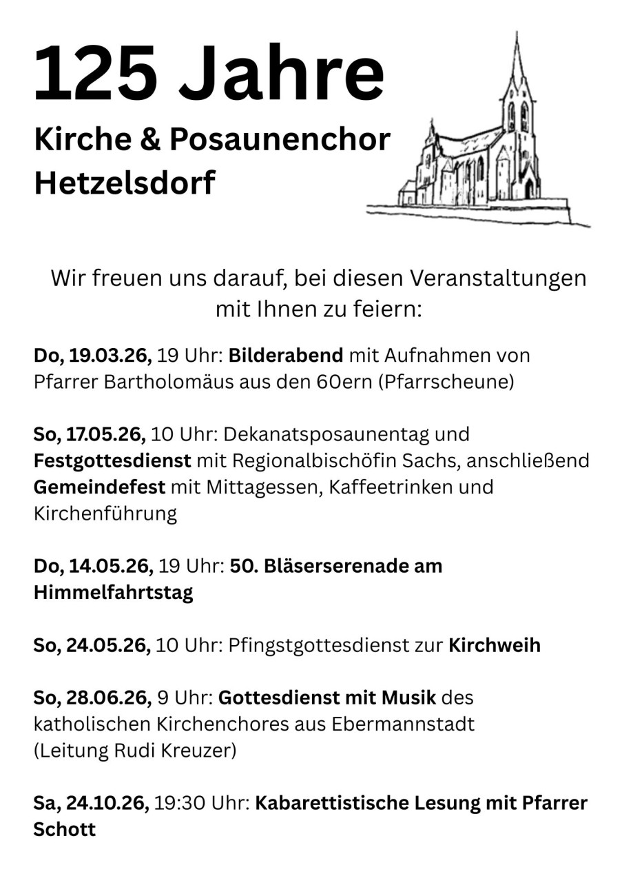 Herzlich Willkommen auf den Seiten der Kirchengemeinden Wannbach und Hetzelsdorf! Aktuelles Classic Brass Konzert am 13.12.25 um 18 Uhr in Hetzelsdorf Bildrechte classic brass Am Samstag, dem 13. Dezember 2025 um 18:00 Uhr findet wieder ein Konzert mit Classic Brass in der Matthäuskirche in Hetzelsdorf statt, mit dem Titel »Fröhliche Weihnacht überall«. Der Eintritt ist frei, es wird um Spenden zur Kostendeckung gebeten. Weiterlesen über Classic Brass Konzert am 13.12.25 um 18 Uhr in Hetzelsdorf Ökumenische Adventsmomente Bildrechte kost Weiterlesen über Ökumenische Adventsmomente Fröhlicher Kreis im November Bildrechte kost Weiterlesen über Fröhlicher Kreis im November Midlife Walkers - Letztes Treffen vor der Winterpause Bildrechte kost Weiterlesen über Midlife Walkers - Letztes Treffen vor der Winterpause Mini-Kirche im Winter 25/26 Bildrechte kost Weiterlesen über Mini-Kirche im Winter 25/26 Regionaler Gottesdienst am Reformationstag (31.10.25) Bildrechte Kieslich Weiterlesen über Regionaler Gottesdienst am Reformationstag (31.10.25) Konzert in Hetzelsdorf am 25.10.25 mit dem Dekanatskammerchor Sonorité Bildrechte kögel Weiterlesen über Konzert in Hetzelsdorf am 25.10.25 mit dem Dekanatskammerchor Sonorité Angebote für Kinder und Familien im Herbst und Winter 25 Bildrechte kost Weiterlesen über Angebote für Kinder und Familien im Herbst und Winter 25 Midlife Walkers im Herbst Bildrechte kost Weiterlesen über Midlife Walkers im Herbst Mini-Kirche im Juli Bildrechte Kost Weiterlesen über Mini-Kirche im Juli Seitennummerierung Aktuelle Seite 1 Seite 2 Seite 3 Nächste Seite Weiter > Last page Ende » Unsere nächsten Veranstaltungen Bildrechte Bilddatenbank Fundus Unser Online-Angebot Unsere Gottesdienste auf You-Tube Gemeindeleben Gemeindeleben - das heißt Gemeinschaft leben Informationen zu unserem aktiven Gemeindeleben finden Sie unter den folgenden Menüpunkten. Kirchengemeinde Hetzelsdorf Informationen zur Kirchengemeinde Hetzelsdorf finden Sie unter folgenden Menüpunkten. Kirchengemeinde Wannbach Informationen zur Kichengemeinde Wannbach finden Sie unter folgenden Menüpunkten. Termine Die Termine der beiden Kirchengemeinden Hetzelsdorf und Wannbach im Überblick. Kontakte Wir freuen uns, wenn Sie Kontakt mit uns aufnehmen. Tageslosung Liturgischer Kalender Liturgischer Kalender Aktueller Feiertag: 30.11.2025 Tag des Apostels Andreas Wochenspruch: Jes 52,7 Wochenpsalm: Ps 146,1–10 Predigttext: 5. Mose 30,11–14 Der nächste hohe kirchliche Feiertag: 25.12.2025 Christfest I Zum Kalender KV-Wahl 2024 Für Kinder Sonntagsblatt.de